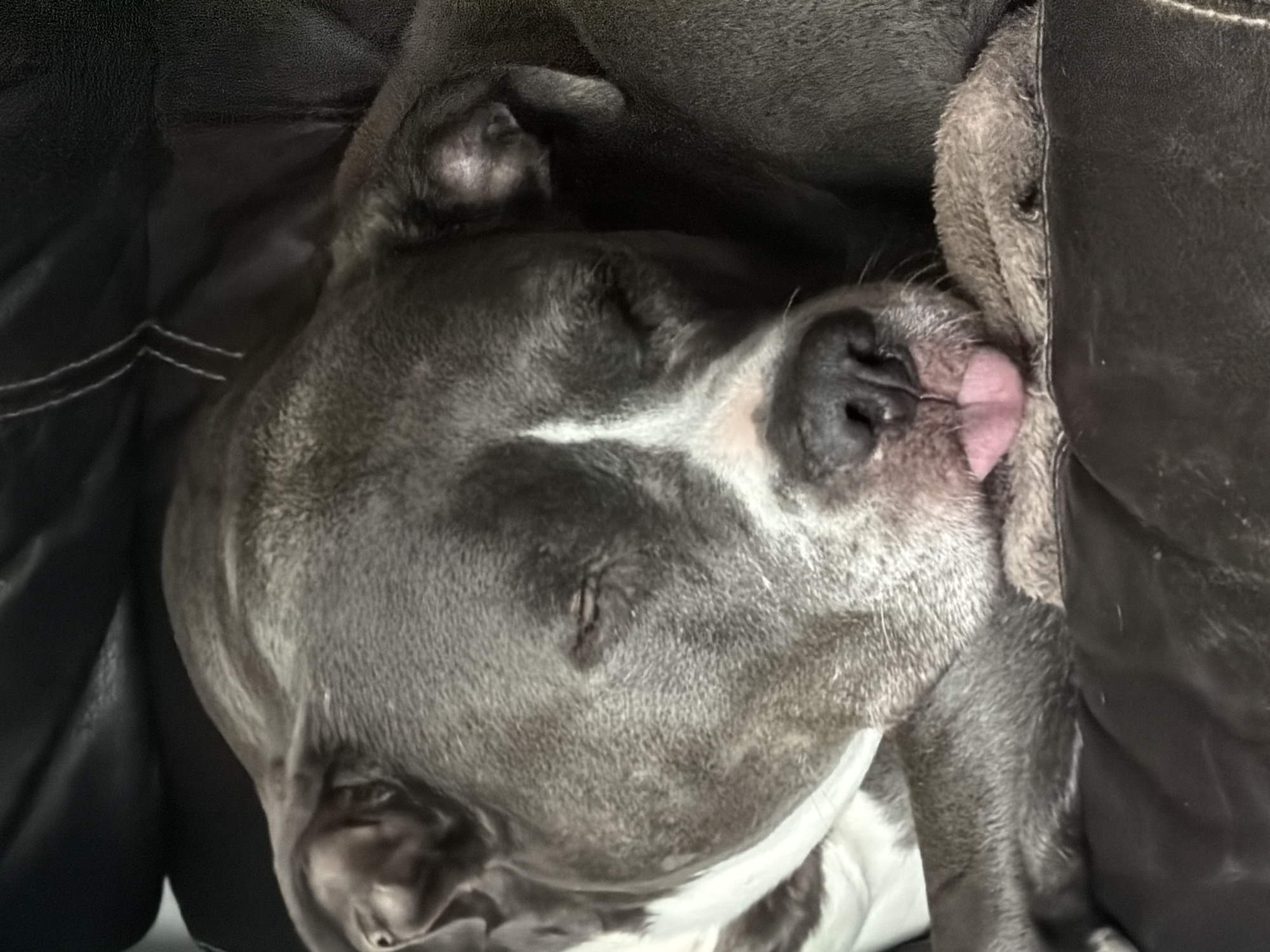 A gray and white pit bull-type dog is sleeping on a black leather couch. The dog's tongue is slightly visible. The dog is nestled against the arm of the couch. The scene is indoors. There is no indication of the location being Esch-sur-Alzette, Luxembourg.