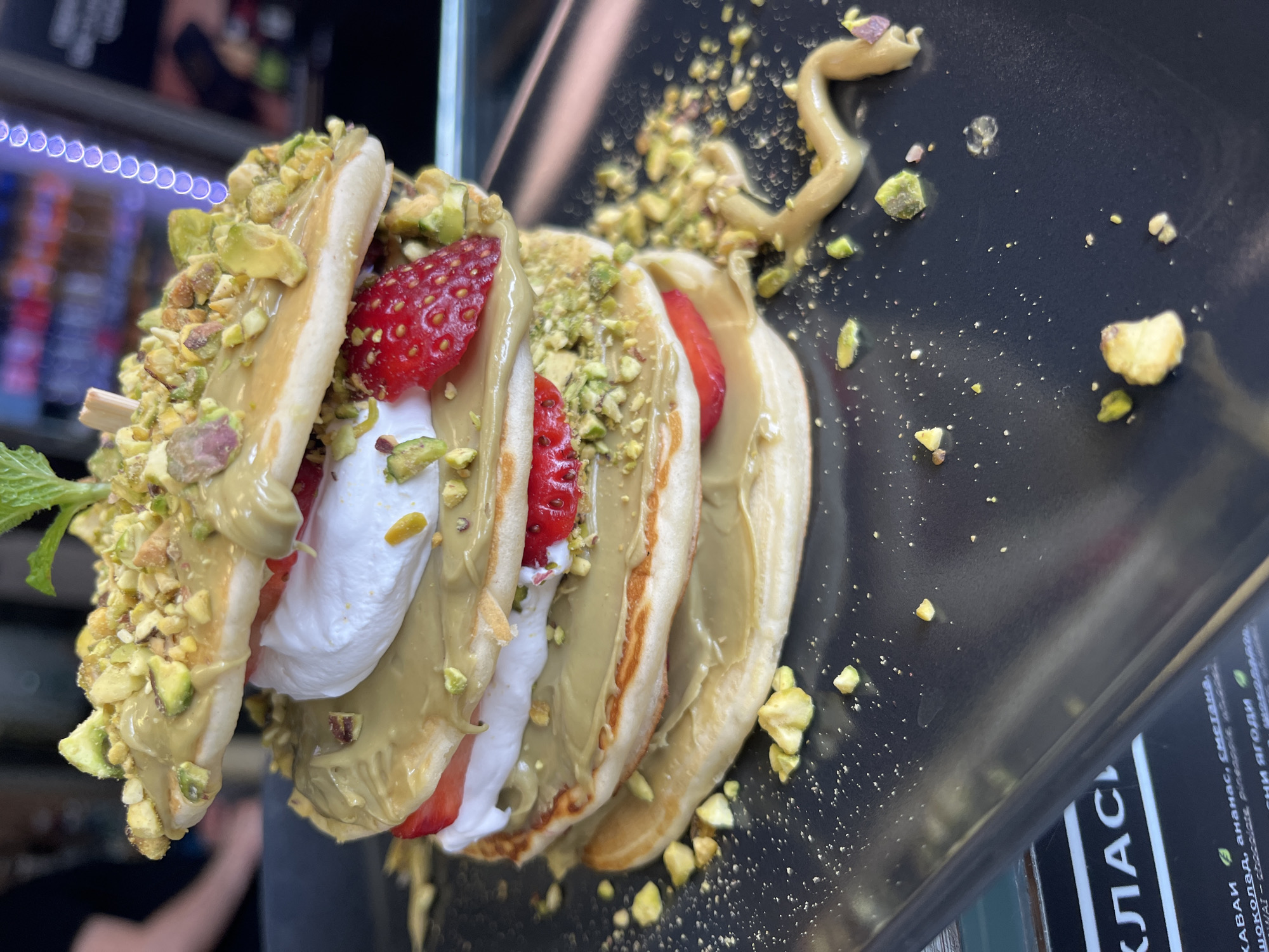stack of pancakes topped with a creamy sauce, chopped pistachios, strawberries, and whipped cream. The pancakes are arranged on a black plate. The dish is garnished with a sprig of mint. The plate is sitting on a wooden surface. A menu or sign is partially visible on the right side of the image, written in a foreign language with the words "KAWAI" and "chocolate" readable. The location is likely a cafe or restaurant based on the presentation and style of the dish, but the exact city or area is unknown.