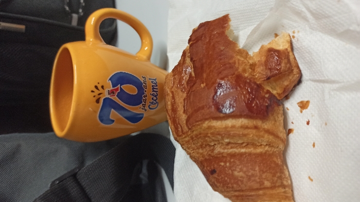 A partially eaten croissant rests on a crumpled white napkin. Adjacent to it is an orange mug with a blue and white logo reading "70 jaar-ans Cécémel." The mug is tilted towards the croissant. A dark-colored bag with metallic accents is visible behind the mug, providing a contrasting background. The composition suggests a casual breakfast setting.