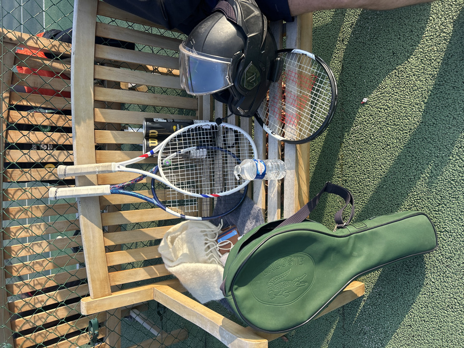 The scene depicts a collection of items on and around a wooden slatted bench adjacent to a tennis court