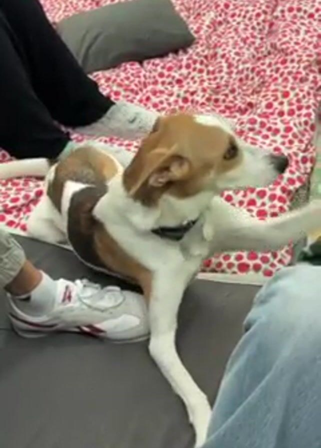A white and brown medium-sized dog lies on a red and white printed mat in a room with a white wall. The dog is positioned between two seated people, one in black pants and grey socks and shoes, the other in blue jeans. The dog turns its head to the right and yawns. A grey pillow is on the mat near the person in black pants.