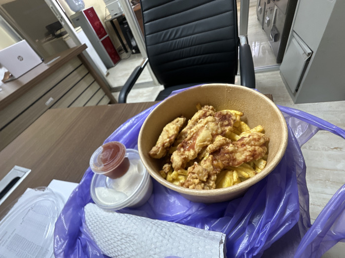 The image depicts an indoor office setting, potentially located in Shaba, Nigeria, though specific geographic identifiers are not visible within the frame. In the central foreground, a light brown, possibly paper-based, bowl contains a meal consisting of golden-brown French fries topped with several breaded chicken strips, partially covered in a reddish-brown sauce. To the immediate left of the bowl, two small, clear plastic containers with lids are present; one holds a red liquid sauce, and the other a white creamy sauce. These food items rest on a crumpled purple plastic bag, which is positioned on a light brown wooden desk. In the mid-ground, a black office chair with a ribbed backrest is visible. To the left of the food, on an adjacent wooden desk, an open silver or white HP laptop is positioned. The background reveals an office environment with a doorway leading to another room, where a red water dispenser and a gray metal cabinet or storage unit are discernible. No individuals are present, and no actions or interactions are depicted within the scene.