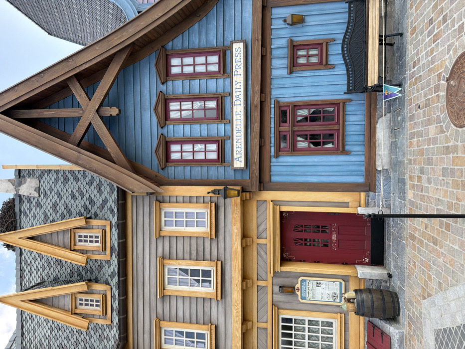 The image displays the exterior of two adjacent, multi-story themed buildings in Chessy, France. No people are present. The left building features gray horizontal siding with light wood-toned trim around its openings. Its roof is covered with dark gray, scaly tiles, from which two prominent dormers with steep, pointed light wood-toned gables project. A small bird's nest is visible on the roof near the left gable, and a light-colored chimney extends skyward. The upper floor exhibits three rectangular windows with white frames and visible white curtains. The ground floor includes a large window to the left and a dark red double door in the center, which appears slightly ajar and has small glass panes in its upper sections. To the left of the door, a wooden barrel holds two brown bottles, positioned beneath a wall-mounted dark lantern and a light blue information board titled "ARENDELLE DAILY PRESS." A small reddish-brown cellar door is partially visible at ground level. The adjacent right building features light blue horizontal siding with dark red window trim and dark brown structural elements. Its steep gable roof includes prominent dark brown cross-bracing. Three rectangular windows with dark red frames and white curtains are visible on the upper level. A horizontal sign reading "ARENDELLE DAILY PRESS" in white lettering is mounted between the upper and lower window sets. The ground floor displays a larger rectangular window to the left and a smaller one to the right, both with dark red frames and white curtains. A dark wooden bench with a decorative metal backrest is positioned below these windows, with a small purple and teal triangular banner draped over its right armrest. A dark lantern is mounted on the wall above the bench. The ground surface in the foreground is paved with multi-toned rectangular stones, resembling cobblestones. A circular manhole cover with a decorative pattern is embedded in the paving. Two black stanchions, connected by a white barrier rope, are positioned in the immediate foreground. The sky is a light, overcast blue.