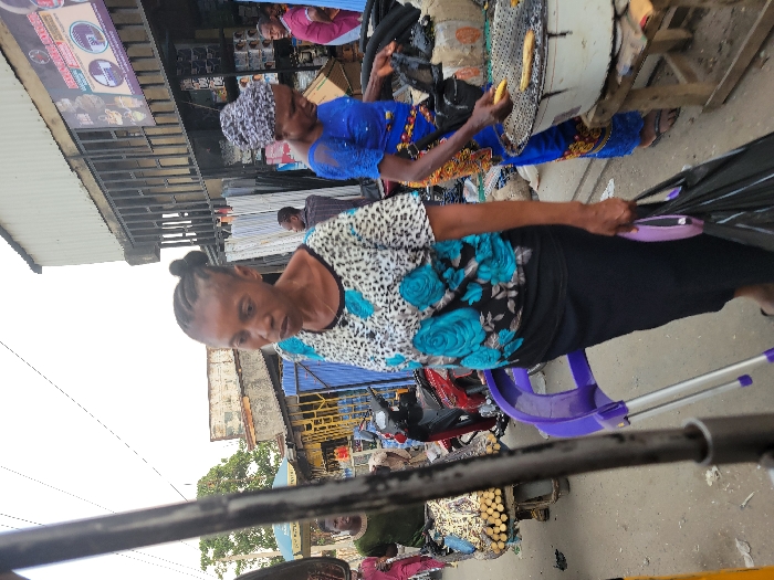 A woman wearing a floral-print top and black skirt walks near a market scene. In the background, another woman in blue attire fries food. A motorcycle and tricycle are also visible amid the market's hustle. The overall scene suggests a vibrant, bustling marketplace atmosphere. The composition is slightly tilted, indicating a candid shot taken in a busy environment.