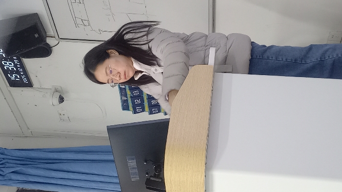 A woman with glasses and a gray coat stands at a desk with a monitor. A wooden partition is on the desk to the right of the monitor. Blue curtains are partially visible at the bottom left. A clock displaying "15:38:29 2025.12.29" is on the wall. An electronic device with the Cisco logo sits above the clock, and a security camera is below it. A whiteboard with drawings is on the wall.