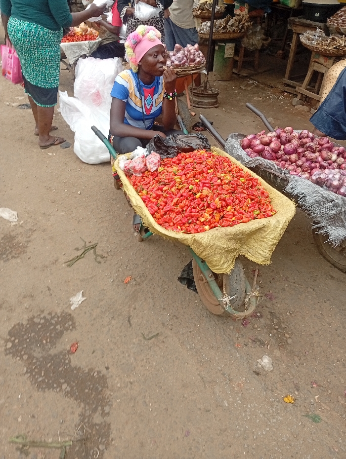 The image depicts an outdoor market scene in Onitsha, Nigeria. In the foreground, a young woman with dark skin sits on the ground, leaning against a green-framed wheelbarrow filled with a large quantity of bright red habanero peppers. She wears a blue, white, and red patterned short-sleeved top, dark pants, and a pink headwrap adorned with colorful pom-poms. Her left arm rests on her knee, and her right hand is near her mouth, suggesting she is eating or chewing something. To her left, small plastic bags containing other produce are placed on the peppers in the wheelbarrow. Another black plastic bag sits between her and the peppers. Immediately to the right of the first wheelbarrow, a second wheelbarrow, partially visible, is filled with purple onions. In the mid-ground, behind the seated woman, several other individuals are present. One woman, partially visible on the left, wears a green and white patterned skirt and brown sandals, holding a pink bag. Further back, various market stalls are visible with goods displayed on wooden tables and woven baskets, including what appears to be dried fish or other food items. The ground is an uneven, light brown dirt or asphalt surface, showing scattered debris such as plastic wrappers, small pieces of refuse, and some darker, damp spots. The overall impression is a bustling, open-air market setting.
