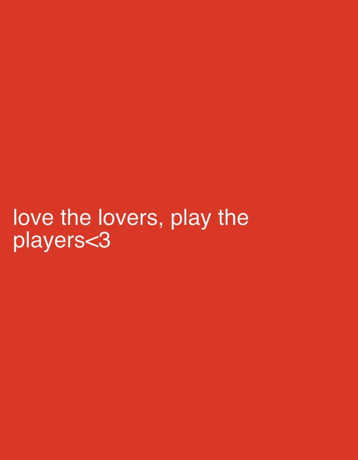 The image displays a solid red background. Centered horizontally in the lower portion of the frame, white sans-serif text reads, "love the lovers, play the players<3". No discernible people, subjects, objects, actions, interactions, or environmental details are present in the image. The image contains no visual information that would indicate a specific location, including the city of Haskovo, Bulgaria.