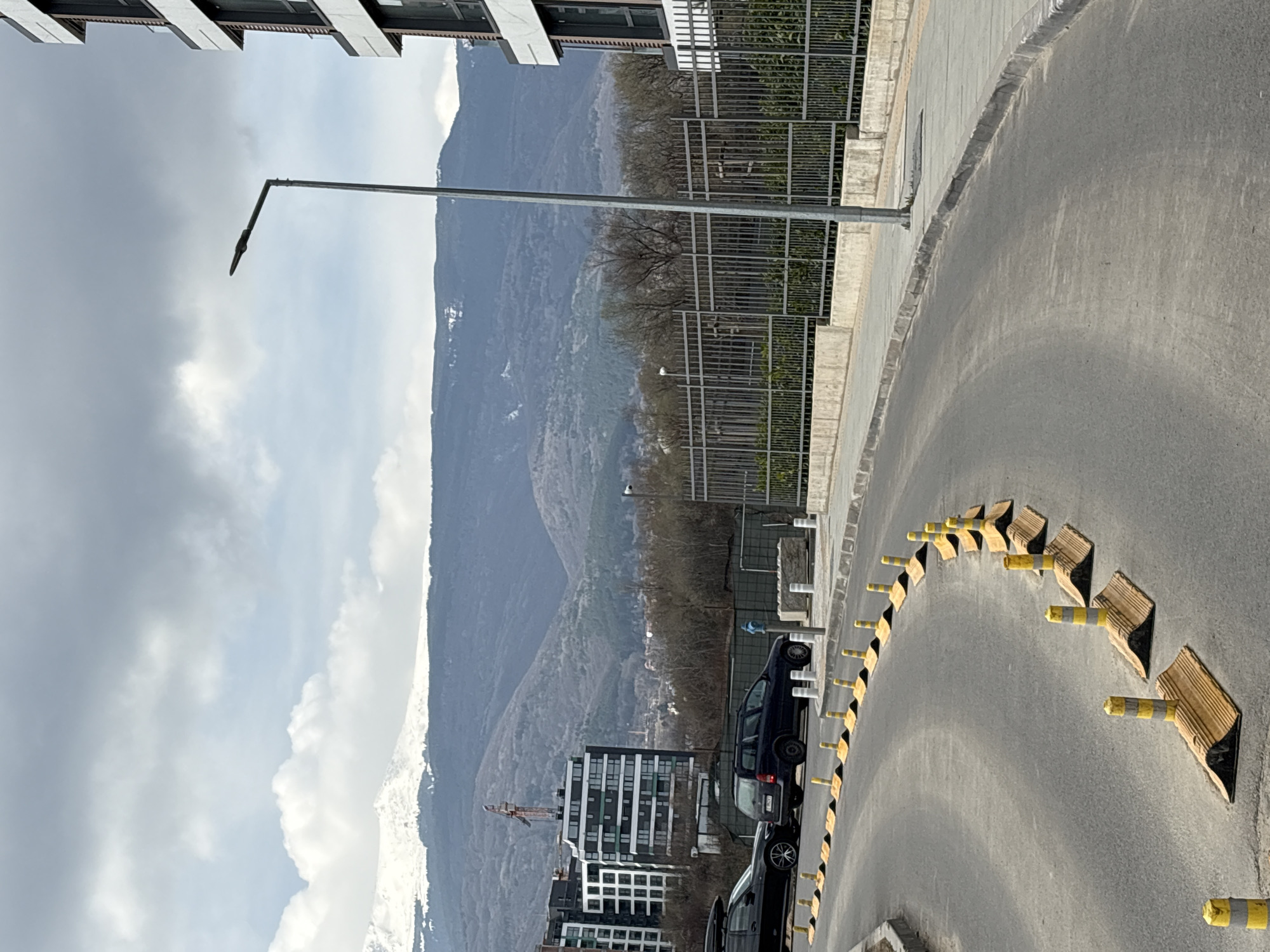 The image depicts an urban landscape in southern Sofia, Bulgaria, with Vitosha Mountain visible in the background. In the foreground, an asphalt road curves to the left, marked by a line of approximately 25 yellow and gray flexible bollards secured on yellow, wedge-shaped bases. A gray concrete sidewalk runs along the right edge of the road, featuring a tall, gray streetlamp with an elongated fixture. Adjacent to the sidewalk on the right is a dark gray metal fence with vertical bars, behind which green shrubs are visible. In the midground on the left, two modern multi-story apartment buildings, one predominantly white and dark gray, the other with a similar facade, are present. A red tower crane is positioned behind the leftmost building, indicating ongoing construction. Two parked cars are partially visible on the left side of the road: a dark sedan with a roof rack, followed by a dark blue station wagon. Further back, beyond additional fencing and sparse, bare trees, a small town or settlement is discernible against the lower slopes of the mountain. The background is dominated by Vitosha Mountain, its peak partially covered in snow under an overcast sky with scattered gray clouds. The lower mountain slopes are forested with bare deciduous trees. No individuals are visible in the scene.