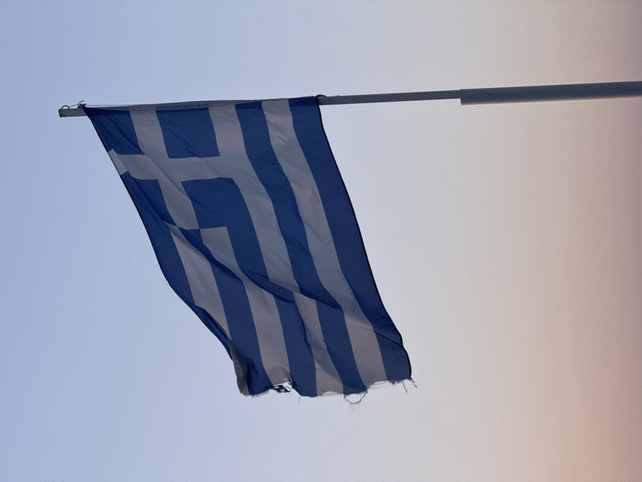 - "A Greek national flag, displaying nine horizontal blue and white stripes with a white cross on a blue canton, is depicted flying from a light-colored flagpole" by FM-bNgni2, licensed under CC BY 4.0