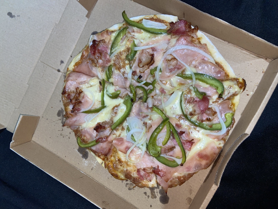 - "A round pizza in a cardboard box is topped with melted cheese, ham slices, bacon bits, green bell pepper strips, and thin white onion rings" by FM-49R4h1, licensed under CC BY 4.0