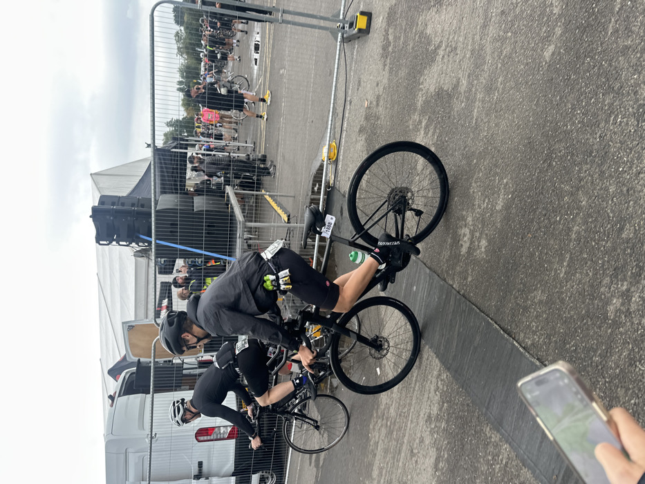 The image depicts an outdoor cycling event taking place on a paved surface under an overcast sky in Weymouth, United Kingdom. In the immediate foreground, a person's left hand holds a smartphone, partially obscuring a dark, wide strip on the asphalt ground, possibly a timing mat. Two male cyclists on black road bikes are central to the midground, moving from left to right. The lead cyclist wears a black helmet, sunglasses, a dark grey long-sleeved top or jacket, black cycling shorts, and black cycling shoes with "Specialized" branded socks. A green water bottle is in a cage on the bike frame, and a race number "1888" is attached to the seat post. A yellow-green pouch and white papers are affixed to the rider's lower back. The second cyclist, positioned slightly behind and to the left, wears a white helmet, a black long-sleeved top, black cycling shorts, and black cycling shoes, with a race bib visible on their lower back. Both cyclists are actively pedaling. To the left, behind the cyclists, the rear of a white utility van with its doors open is visible, adjacent to a large white marquee tent. To the right of the cyclists, a metal barrier system separates the cycling track from an event area. Behind these barriers, a stage structure is equipped with multiple stacked black speaker units. Various individuals are present in this background area; one person in a yellow high-visibility vest stands near the speakers, and another, further right, appears to be holding a microphone. A crowd of participants, many in cycling attire and helmets, are gathered with bicycles in what appears to be a staging or waiting area. Small puddles are visible on the paved ground in this area. The far background shows trees beneath the overcast sky.
