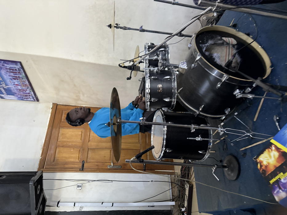 The image depicts an indoor scene within a church in Jos, Nigeria, indicated by a framed picture on the wall displaying "SAMUEL EVANGELIC" and "JOS." An adult male with dark skin, dressed in a light blue long-sleeved shirt and dark pants, is seated facing right, looking forward, while wearing black over-ear headphones. His hands are positioned over a small electronic device, possibly a drum machine, resting on a stand in front of him. He is positioned behind a black five-piece acoustic drum kit, comprising a hi-hat cymbal on the left, two tom-toms (one rack, one floor), a bass drum angled forward with a microphone positioned inside its opening, and a crash or ride cymbal. Several drumsticks are scattered on the blue fabric surface covering the floor beneath the drum kit. To the far left, a black speaker box is mounted on a stand. Behind the man, a light brown wooden door with a silver handle is visible. The walls are plain and light-colored. Numerous audio and power cables are visible on the floor and against the wall on the left. A small black microphone on a stand is positioned near the left tom-tom. A colorful object, partially visible in the bottom-left foreground, bears text including "JESUS."