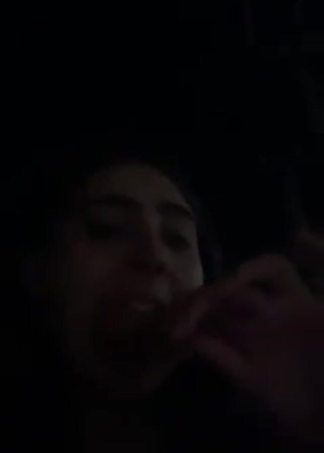 In near darkness, a person with long dark hair is seen eating something. They are holding the item in their right hand and bringing it to their mouth. The environment is very dark, making it difficult to discern specifics. A green light blinks in the lower right corner of the video. The person is speaking, and other voices are audible in the background.