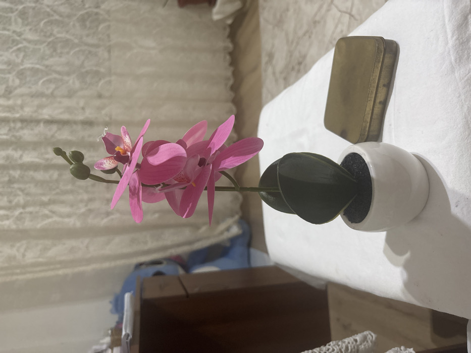 The scene is an interior view within the city of Petrich, Bulgaria. A potted artificial orchid plant, featuring multiple pink blossoms with speckled centers and several green buds, stands prominently in a small, white ceramic pot filled with black granular material. To the right of the plant, resting on a white, textured fabric surface, is a rectangular, brass-colored metal box with a lid. In the blurred background to the left, a dark brown wooden furniture item is partially visible, with white papers or fabric on its surface and a blue object behind it. The central and right background shows a light-colored, patterned curtain hanging, and a faint dark object, possibly another potted plant, is discernible further back near the floor. Artificial lighting illuminates the area, casting a shadow from the orchid plant onto the white surface. No people are present.