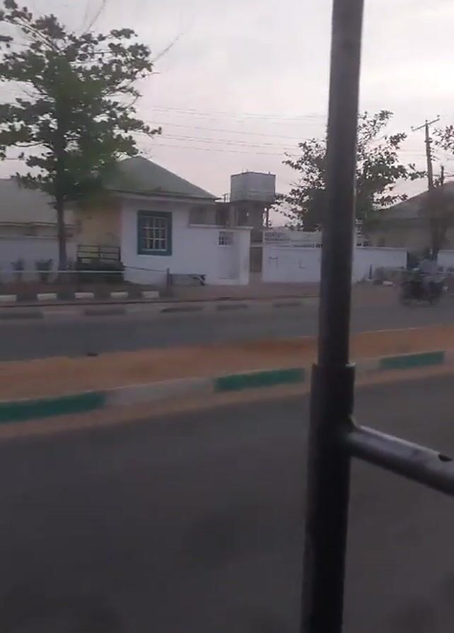 The video is taken from inside a vehicle driving along a road with buildings on one side. The buildings are single-story structures with white walls and green trim, surrounded by fences. Several motorcycles are seen driving on the road in the opposite direction. The sky is overcast, and the lighting suggests it is either early morning or late afternoon. The video is somewhat shaky due to the movement of the vehicle.