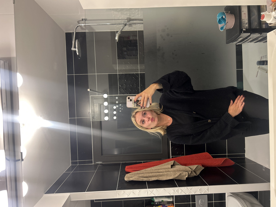 A woman poses in a bathroom mirror, holding her phone. She has blonde hair, wears a black cardigan, and is making a pouting face. The bathroom features black and gray tiled walls, a shower, and a vanity with bright lights. Two towels, one red and one tan, are draped over the edge of the vanity. Toiletries are visible below the vanity.