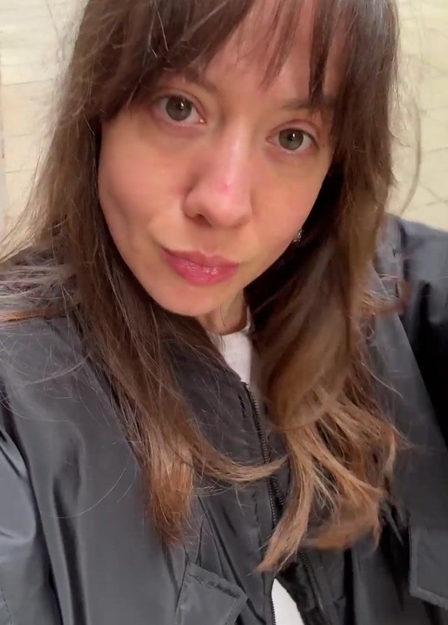 A woman is seen in a selfie-style video, standing outside on a cloudy day. She is wearing a black bomber jacket over a white shirt. Her hair is long and brown with bangs. The background shows a brick building with foliage growing on it, as well as a tiled walkway. She makes a slight smile towards the end of the video.