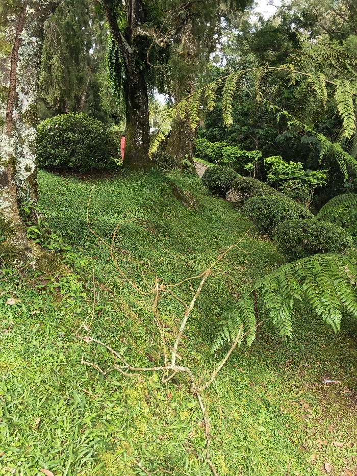 The scene is a lush, verdant outdoor landscape located at Bangalum Bridge, Papua New Guinea. The foreground is covered in bright green, short-cut grass, with a cluster of tangled, dry, light brown branches positioned centrally. A large tree trunk, partially covered in pale green lichen, anchors the left side of the frame. In the mid-ground, a prominent tree trunk heavily adorned with dark green epiphytic ferns and moss rises from a grassy mound. Behind a dense, trimmed dark green bush to the left of this central tree, a person wearing a red garment is partially visible, with only a vertical section of their back exposed. Further into the mid-ground and background, a winding pathway of lighter color can be discerned, bordered by a series of neatly shaped dark green shrubs. Large, vibrant green fern fronds extend into the lower right of the image, and a dense canopy of trees and foliage forms the background. The environment is well-lit by natural daylight.