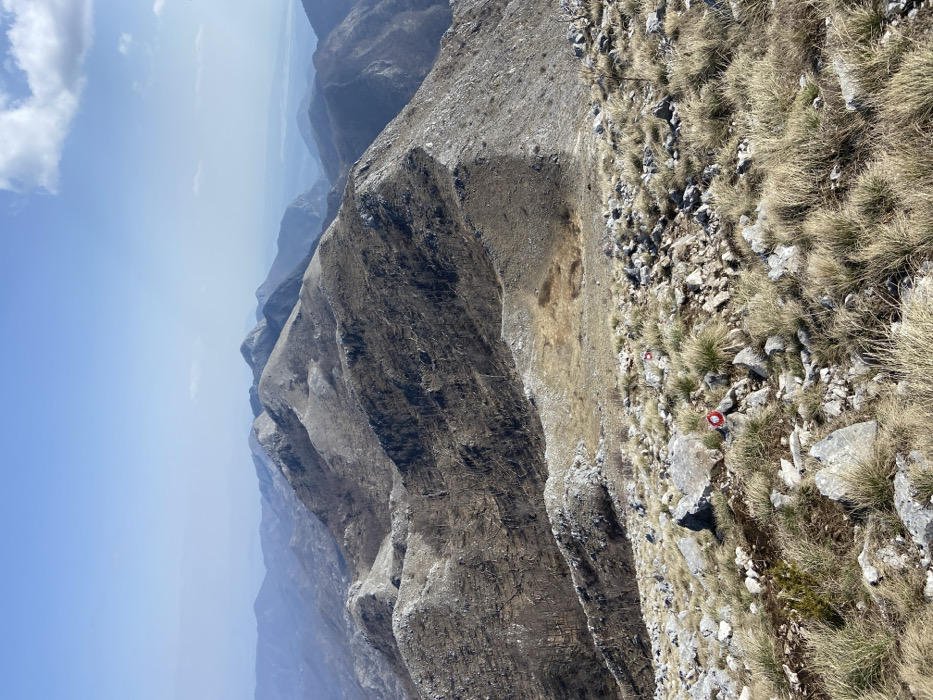 The scene depicts a panoramic view of an extensive mountainous terrain, identified as being within the vicinity of Golubovci, Montenegro. The sky occupies the upper third of the frame, presenting a clear, pale blue hue with minor wisps of white cloud visible in the upper right quadrant. The foreground consists of an irregular, upward-sloping expanse characterized by gray-white limestone rocks and patches of dry, straw-colored grass. Two circular trail markers, featuring a red outer ring and a white inner circle, are present on the ground: one in the lower-left corner and another towards the lower-center. Moving into the midground, a series of successive mountain ridges and valleys are visible. Many slopes on these ridges display a dark, mottled appearance attributed to numerous leafless deciduous trees and exposed rocky surfaces. A notable feature in the mid-center is a shallow, oval-shaped depression of darker earth, situated within a saddle between two peaks. The background comprises multiple layers of mountains receding into a distant atmospheric haze, with a significant body of water, likely Lake Skadar, visible on the far right horizon. No human or animal figures, nor any specific actions, are discernible in the image.