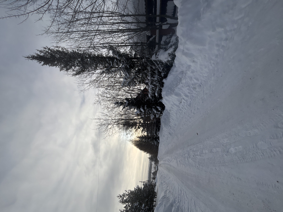 A snow-covered road stretches into the distance, flanked by snow-laden trees and bushes