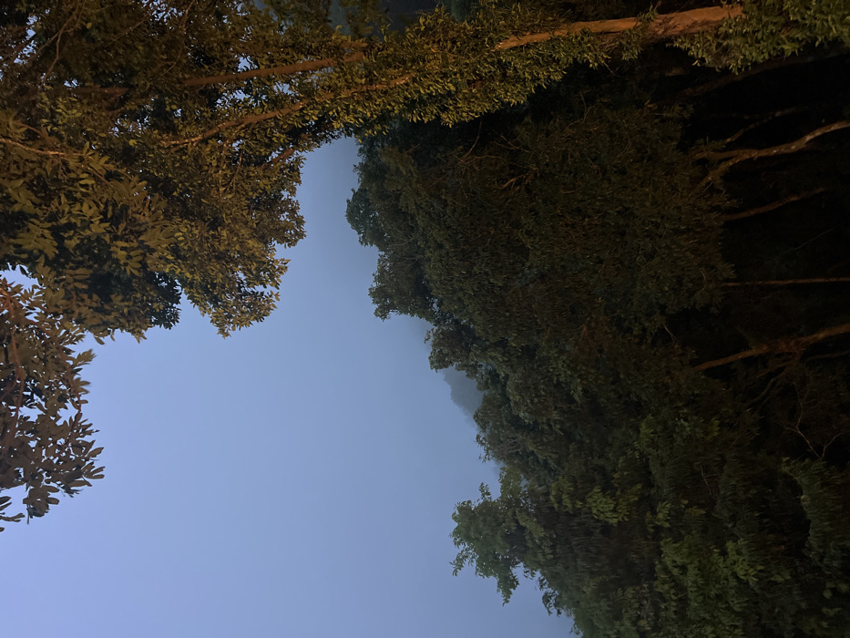 This image displays a dense, forested landscape in Ko Samui, Thailand, under conditions of significant atmospheric moisture. The upper half of the frame reveals a light blue-grey sky partially obscured by a thick layer of fog or mist that envelops distant hills or mountains. The lower half and midground are dominated by numerous trees with dark green foliage. Specific tree branches and leaves in the upper right and top left quadrants exhibit a distinct yellow-green illumination, indicating the presence of an unseen artificial light source. The trees in the lower and central portions of the image remain in shadow. No human figures, animals, or man-made structures are visible. The scene is static, devoid of discernible action or interaction.