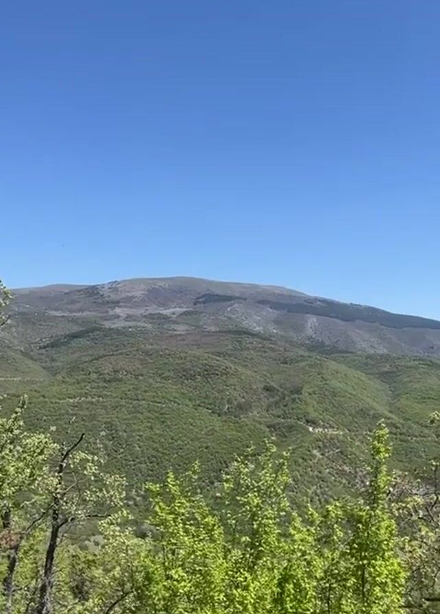 landscape featuring a mountain range under a clear blue sky with scattered clouds. In the foreground, green trees and vegetation partially obstruct the view of the mountains. The camera pans upwards, revealing more of the sky and clouds. As the camera pans down, a dirt road winding through the forested area comes into view. The road appears to be unpaved and stretches into the distance, surrounded by trees and bushes on either side. There is no visible human presence in the video.