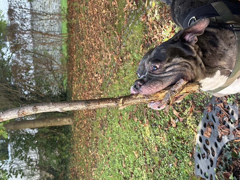 A brindle and white domestic canine, consistent with a bully breed, is captured in an outdoor setting in Stains, France. The dog, wearing a dark harness, is actively engaged in chewing a thick, rough wooden stick, approximately 2-3 inches in diameter, which extends upward out of the frame. The stick exhibits splintering and bark damage at the point of contact with the dog's mouth, where its teeth are embedded. The dog's head is tilted upwards, with its eyes wide and focused on the stick. The ground is a mix of green grass and numerous scattered brown, fallen leaves. In the lower-left foreground, a dark, perforated plastic grate is partially visible beneath the leaves. The background features various trees and sparse bushes, with a light-colored stone wall partially discernible behind the foliage on the right side of the frame.