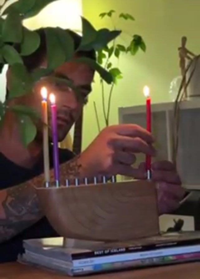A man is placing a red candle into a menorah. The menorah is made of wood and sits on top of a stack of books. Three candles in the menorah are already lit: a beige, a purple, and the red candle. The man is wearing a black t-shirt and has tattoos on his left arm. A green leafy plant is in the foreground, partially obscuring the man. In the background, a lamp and another plant are visible. The wall behind the man is light green. A white shelf with various objects is also in the background.