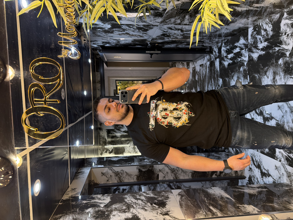 A male individual is captured in a mirror selfie within the interior of "ORO by Morado" in Plovdiv, Bulgaria