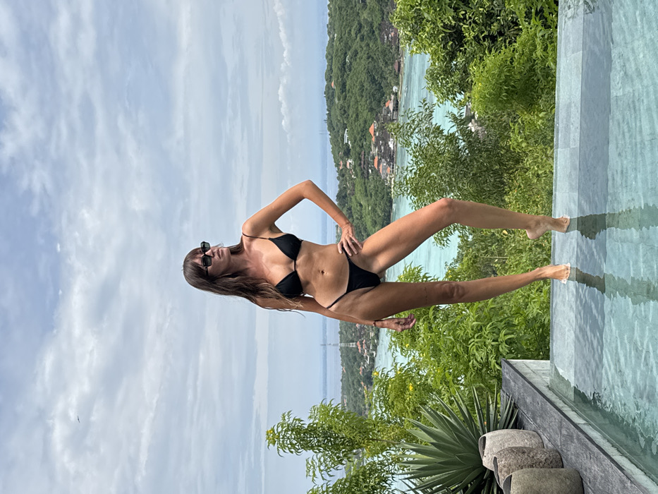 A tanned woman in a black bikini and sunglasses stands next to an infinity pool, with one hand on her hip. Her dark hair is shoulder-length. Lush green vegetation surrounds the pool area. In the background, there's a body of water with small buildings visible along the shoreline and a slightly cloudy sky. The image is oriented sideways, with the woman facing left.