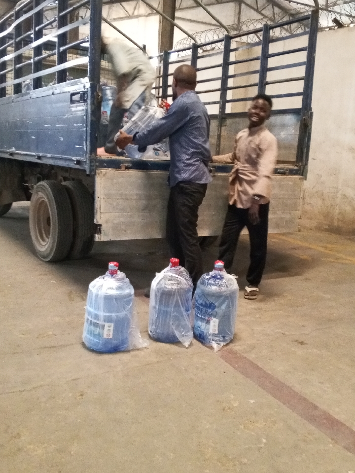 The image depicts a loading operation occurring within a covered facility in Dakata, Nigeria. A blue flatbed truck with metal cage-like sides is parked with its rear towards the viewer. Three adult males are present. One male, wearing light-colored clothing, is partially visible inside the truck bed, appearing in motion blur as he handles large bottled water containers. Another male, wearing a blue patterned long-sleeved shirt and dark trousers, stands at the rear of the truck, receiving or transferring these same large water bottles. A third male, wearing a tan shirt and dark trousers, stands to the right, leaning against the truck, smiling directly at the camera. He is wearing light-colored flip-flops. On the concrete floor in the foreground, three large, clear plastic water bottles, each approximately 5-gallon capacity, are individually wrapped in clear plastic bags and fitted with red caps. One bottle displays a visible "BERG" label. The background shows a concrete wall with exposed metal structural elements and coiled barbed wire along a higher section. The lighting suggests an indoor or sheltered environment.