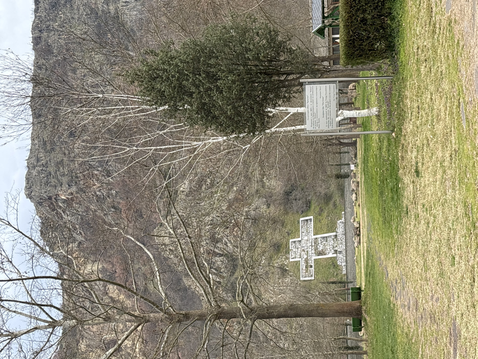 This image depicts an outdoor scene in the village of Bistrica, near Blagoevgrad, Bulgaria. The environment is characterized by a park-like foreground transitioning to a rugged, mountainous background. In the foreground, a path of packed dirt winds through dry, yellowish-green grass. To the left of the path, two green, open-top refuse bins are visible near the base of a large, bare deciduous tree with light grey bark and thick branches. To the right, another clump of bare, white-barked deciduous trees stands next to a dense, dark green coniferous tree. An informational sign, mounted on two grey metal posts, is positioned to the right of the coniferous tree. The sign contains text in both Bulgarian (Cyrillic script) and English, identifying the large cross in the background as "Sculpture 'The Cross'", created in 2009 by the Congo Foundation. Behind the sign and coniferous tree, a small structure with a dark green roof and white facade is partially visible, flanked by a trimmed dark green hedge. The midground features a prominent, large white cross sculpture constructed from irregular stones and mortar, situated on a grassy slope. This cross is approximately twenty feet in height and width, with a darker, rocky core framed by lighter, mortared edges. Around the base of the cross, several clusters of natural grey stones are scattered. The slope behind the cross is sparsely covered with dry grass and bare deciduous shrubs and trees. The background consists of a substantial, rocky mountain range with varied geological textures and colors, predominantly shades of grey and brown, under a partially overcast sky. No individuals are present in the image, and no specific actions or interactions are depicted. The overall impression is one of early spring or late winter, given the bare branches of most trees.