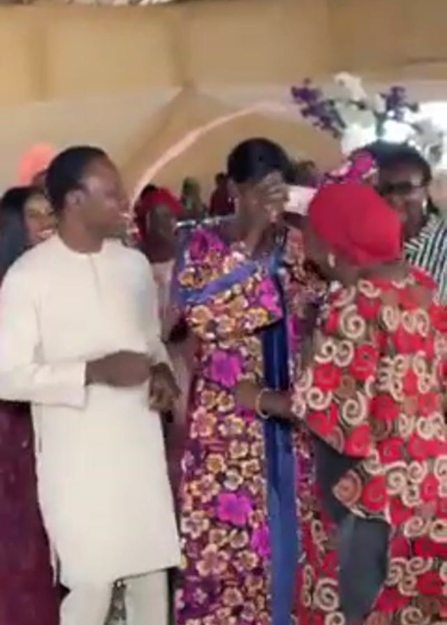 The video captures a joyous moment at what appears to be a wedding reception or similar celebration, taking place indoors. A group of people are gathered, predominantly women dressed in vibrant, patterned dresses and head coverings, indicating a cultural event. At least one woman is wearing a blindfold and holding a gift bag, suggesting a game or tradition. A man in a white outfit stands among the crowd, smiling and interacting with the blindfolded woman. The environment includes a decorated archway and general festive setup, suggesting an atmosphere of celebration and community.