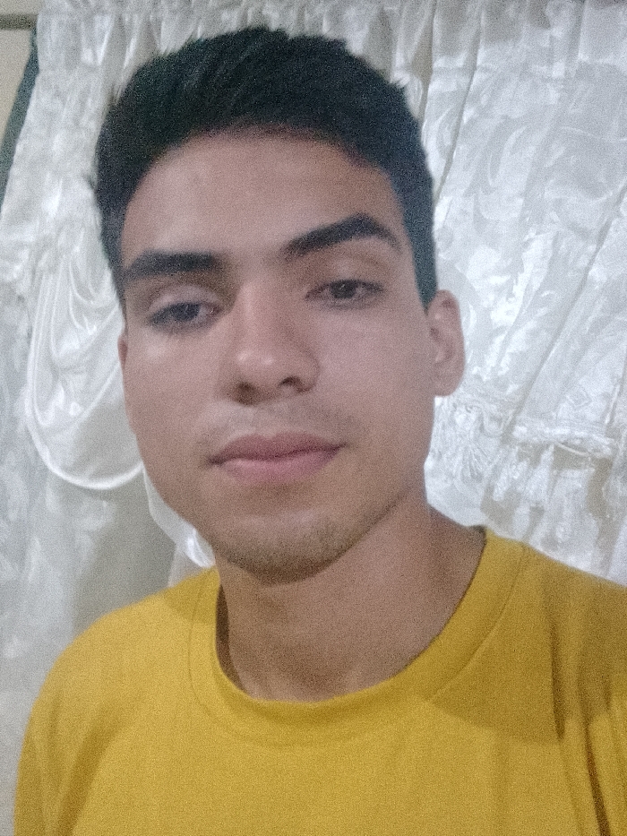 The image presents a head-and-shoulders portrait of a young adult male, estimated to be in his late teens or early twenties, looking directly into the camera. He possesses short, dark hair, prominent dark eyebrows, dark eyes, a straight nose, and full lips, with discernible light stubble on his chin and upper lip area. The subject is wearing a plain, round-neck, mustard yellow t-shirt. The background consists entirely of a light-colored, possibly white or off-white, patterned curtain exhibiting vertical folds, indicating an indoor environment. No other individuals or objects are visible. The specific location within the city of Unknown, Unknown cannot be determined from the visual evidence.