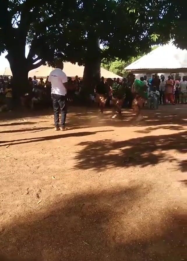 dirt area with several people. A man in a white shirt and jeans stands in the foreground while several individuals in leopard print clothing dance in a circle around him. Behind them, there are dozens of spectators sitting and standing around the perimeter of the performance area. Large trees provide shade to a portion of the crowd. A white building is visible in the background. The day appears sunny.