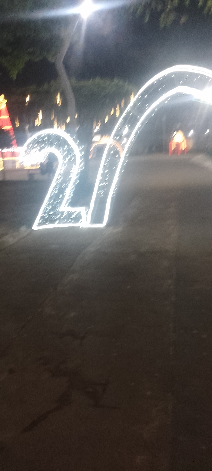 The image depicts an outdoor night scene in La Fría, Venezuela. In the midground, large illuminated structures form the numbers '2' and '1' in white lights, positioned on a dark ground surface. To the immediate right of the number '1', a white illuminated archway is partially visible, extending upwards and to the right. Further in the background, dark tree foliage is present, interspersed with blurred yellow and orange lights. A distinct bright light source in the upper center creates a prominent lens flare. A small, indistinct structure with red illumination is visible further down the path in the background. The ground is dark, appearing to be paved, with some visible cracks and irregularities. No individuals are present in the frame.