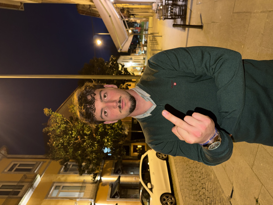 The image captures a young adult male standing on a cobblestone street at night in Braga, Portugal. The male is positioned centrally, facing directly towards the viewer, with a neutral expression. He possesses dark, curly hair and a styled mustache and goatee. He is dressed in a dark green V-neck sweater, displaying a small logo on the left chest, over a light-colored collared shirt. A watch with a dark strap and several thin, colorful bracelets are visible on his left wrist. His left hand is raised, with the middle finger extended upward, forming a discernible gesture. In the background to the left, a multi-story building with a yellow facade, featuring multiple windows and balconies with ornate railings, is illuminated. A white five-door hatchback vehicle is parked on the cobblestone street in front of this building. To the right of the subject, a street extends into the distance, bordered by buildings. One building on the right side features a white awning covering an outdoor dining area furnished with dark tables and chairs. Multiple streetlights provide artificial illumination to the scene under a dark night sky. A tall, dark pole rises vertically in the mid-ground.