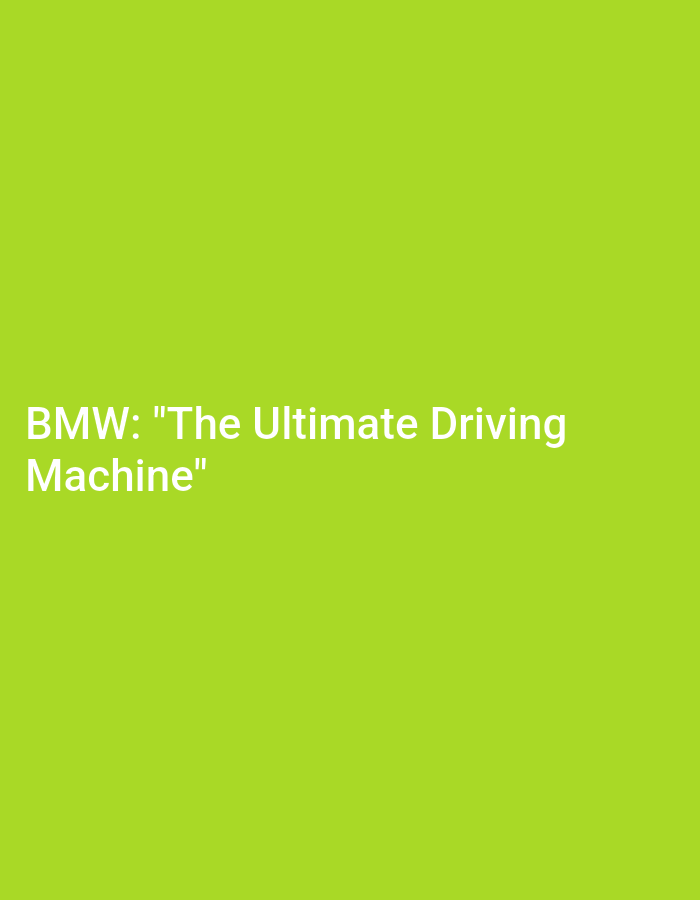 This digital graphic image, presented in the context of Mansehra, Pakistan, displays a solid, uniform lime green background. White sans-serif text is positioned in the lower-left quadrant, stating 'BMW: "The Ultimate Driving Machine"'. No individuals, specific physical objects, actions, or interactions are visually depicted within the image. The environment is represented solely by the monochromatic green color field, with no discernible geographical features or urban landscape of Mansehra or any other location visible.