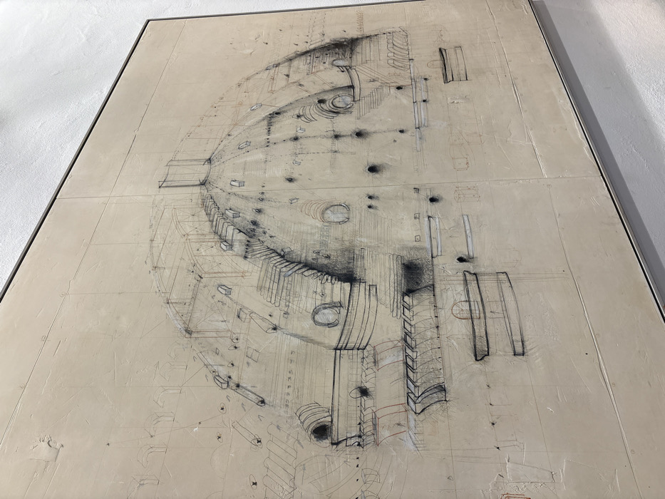 A large, framed mixed-media artwork is displayed on a white wall in an exhibition space in Copenhagen, Denmark. The artwork, presented on a light beige, textured surface with visible seams indicating multiple panels, depicts an intricate architectural drawing of a large dome structure. Executed primarily in charcoal and graphite with sparse red pencil accents, the drawing illustrates an exploded view or cross-section, revealing multiple layers of the dome. Notable details include external arched window openings, curvilinear staircases or buttresses, and an underlying structural framework rendered with both precise construction lines and darker, smudged shading. The artwork is enclosed within a thin, dark metallic frame. No people, subjects, or actions beyond the static display of the artwork are present.