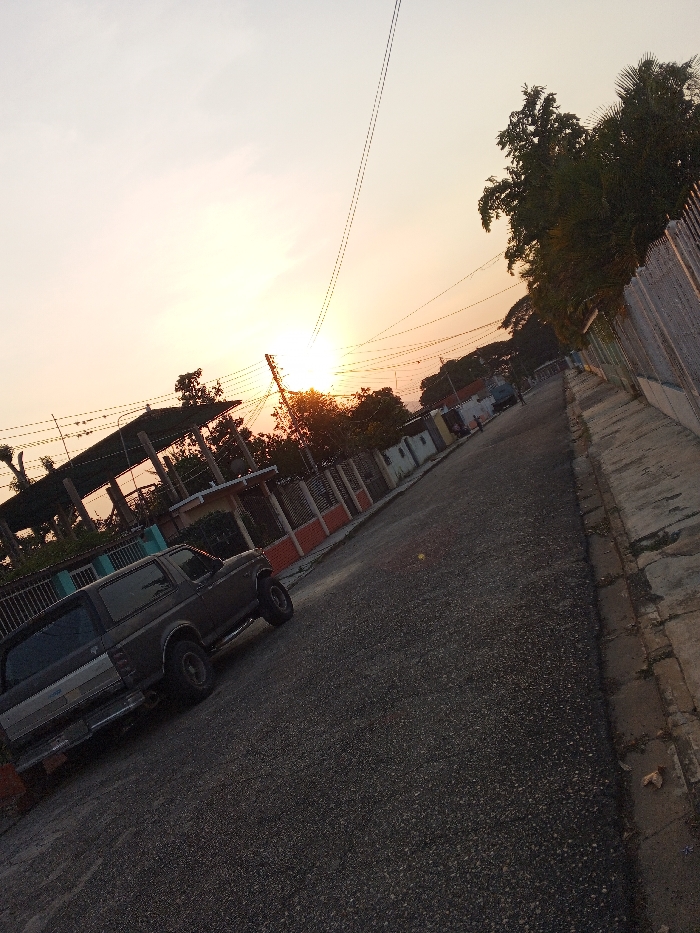 The image presents a residential street scene in Tinaquillo, Venezuela, illuminated by the low-angle sun, indicating either sunrise or sunset