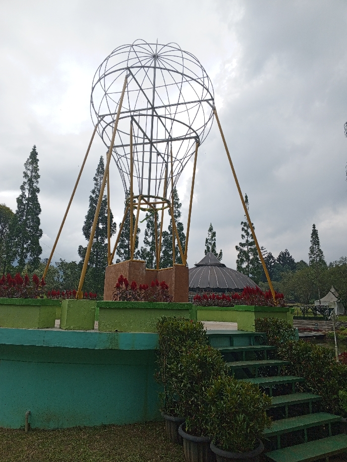 A metal hot air balloon structure stands on a green raised platform with red flowers
