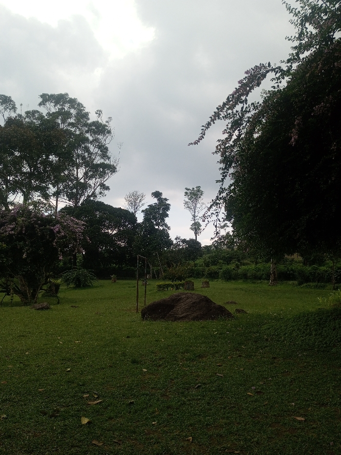 The image displays a natural outdoor environment in Nghĩa Đồng Commune, Vietnam, under an overcast sky. The foreground and midground are covered by a consistently green, short-cropped grassy surface, with occasional scattered dark leaf debris. A prominent, dark, irregularly shaped rock or mound is situated centrally in the midground. Directly behind this rock, two slender, vertically oriented wooden posts are driven into the ground, appearing to form a partial rectangular frame or support structure. The background consists of dense vegetation, including numerous trees of varying heights and foliage density. A bush with light purple blossoms is visible on the left side of the midground. Taller trees with more sparse canopies rise against a uniformly light gray, cloudy sky. No human or animal subjects are present, and no specific actions or interactions are depicted. The scene is illuminated by soft, diffused natural light.