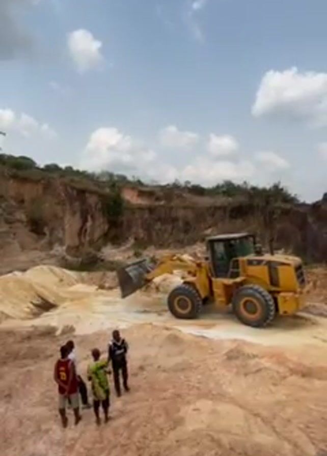 A yellow front-end loader sits in a sand pit area next to a group of four people