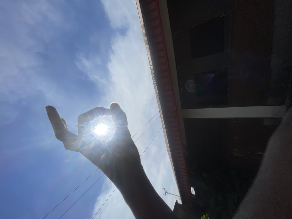 The image captures an outdoor scene in Jos, Nigeria, under direct sunlight. A human hand, silhouetted against a bright blue sky with scattered white clouds, occupies the upper-left portion of the frame. The hand is positioned to form a circular gesture with the thumb and index finger, precisely framing the sun within the opening. This action generates a prominent starburst effect with radiating light rays from the sun. In the mid-ground, multiple dark utility wires extend horizontally across the sky, originating from a partially visible utility pole on the far left. The lower background features a building with a reddish-brown corrugated metal roof and a light-colored fascia board. The building's walls appear dark, exhibiting several dark, rectangular window openings and at least one white vertical support pillar. Dark green foliage is visible beneath the left section of the building's roofline. The overall lighting is strong backlight, silhouetting the foreground elements.