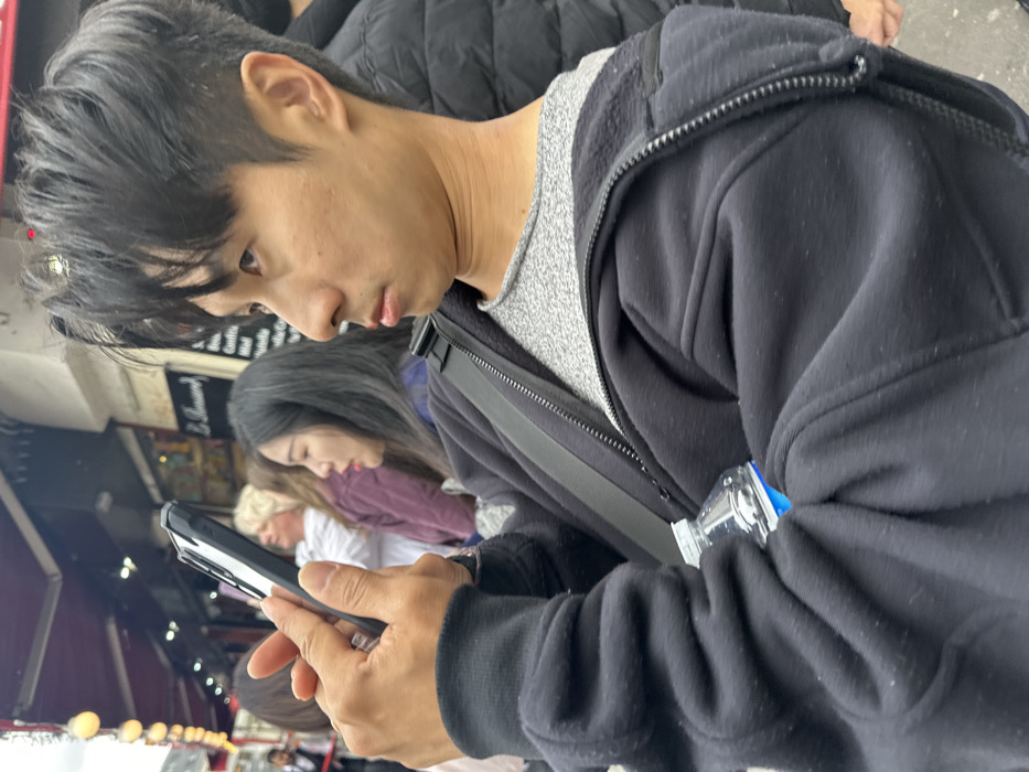 The image captures an Asian male in a close-up, profile view, looking right with a neutral expression. He has dark, textured hair styled upwards with faded sides. He wears a light grey crew-neck t-shirt beneath an unzipped black fleece or hooded jacket, with a black strap traversing his torso diagonally. His left arm is bent, holding a black-cased smartphone upright with both hands. A clear plastic water bottle with a blue label is visible, tucked into the left side of his jacket. In the blurred background, a crowded outdoor environment is depicted. Several individuals are present, including a woman with long dark hair and a purple top, and a person with blonde hair in a white top, both to the left of the main subject. Above them, a building features a red awning adorned with several spherical light fixtures. A dark sign below the awning is partially legible, displaying "Brasserie," "Restaurant," and menu items such as "Confit de Canard," "Jambon de Paris," "Crème brûlée vanille," and "Moelleux au chocolat." This identifies the location as a street-side French brasserie or restaurant in Paris, France.