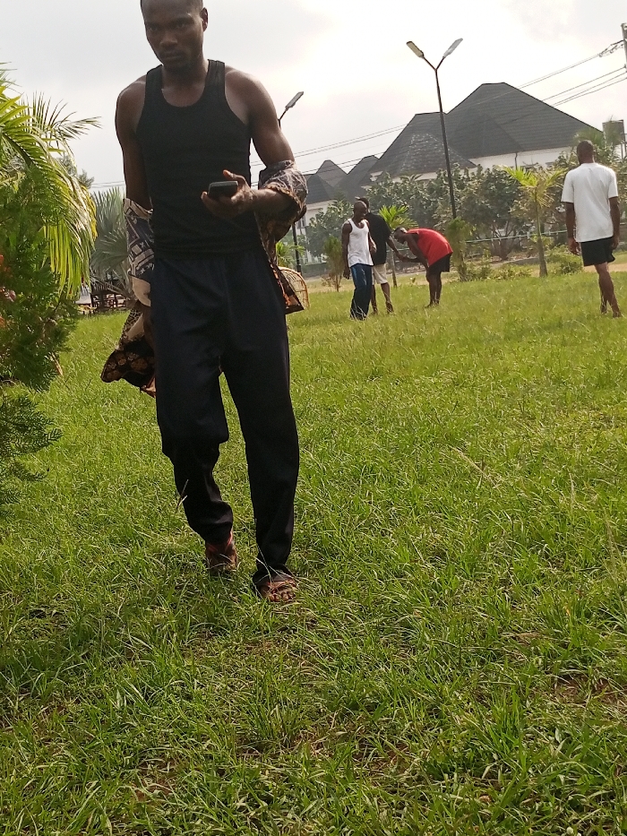 The scene depicts an outdoor grassy area in Owerri, Nigeria, under a bright, overcast sky. A dark-skinned male in the foreground faces the camera, wearing a black tank top, dark trousers, and brown sandals. He holds a dark mobile phone in his right hand, with a patterned garment draped over his left arm. His expression is direct. In the midground, four additional males are observed: one in a white tank top and blue jeans, another in a black shirt and light shorts standing nearby, a third in a red t-shirt bent over towards the ground, and a fourth in a white t-shirt and dark shorts walking away from the viewer. The ground is uniformly covered in green grass. The background features several modern streetlights with dual fixtures, scattered green shrubs, and multiple buildings with dark, steeply sloped roofs, indicating an urban recreational or public green space.