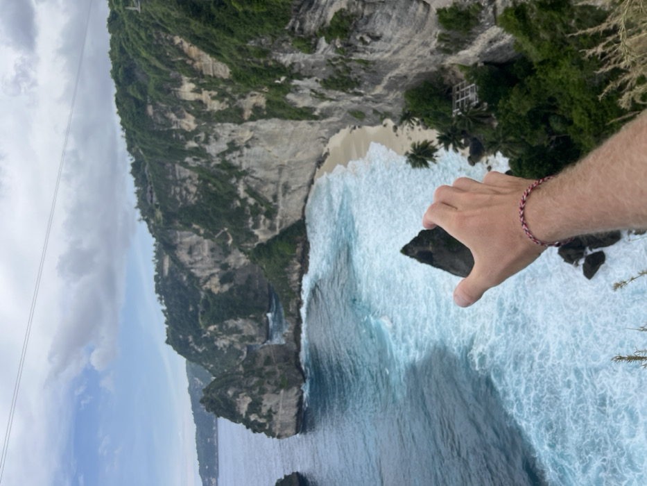 A landscape view of a tropical shoreline with tall cliffs, lush greenery, and a small sandy beach. The water is a mix of blue and white, suggesting waves crashing against the rocks. A person's arm extends into the frame from the right, with a hand positioned as if holding or pinching a small, dark rock formation in the water. The angle of the photo creates a sense of depth, making the cliffs appear especially steep and the drop to the ocean dramatic.