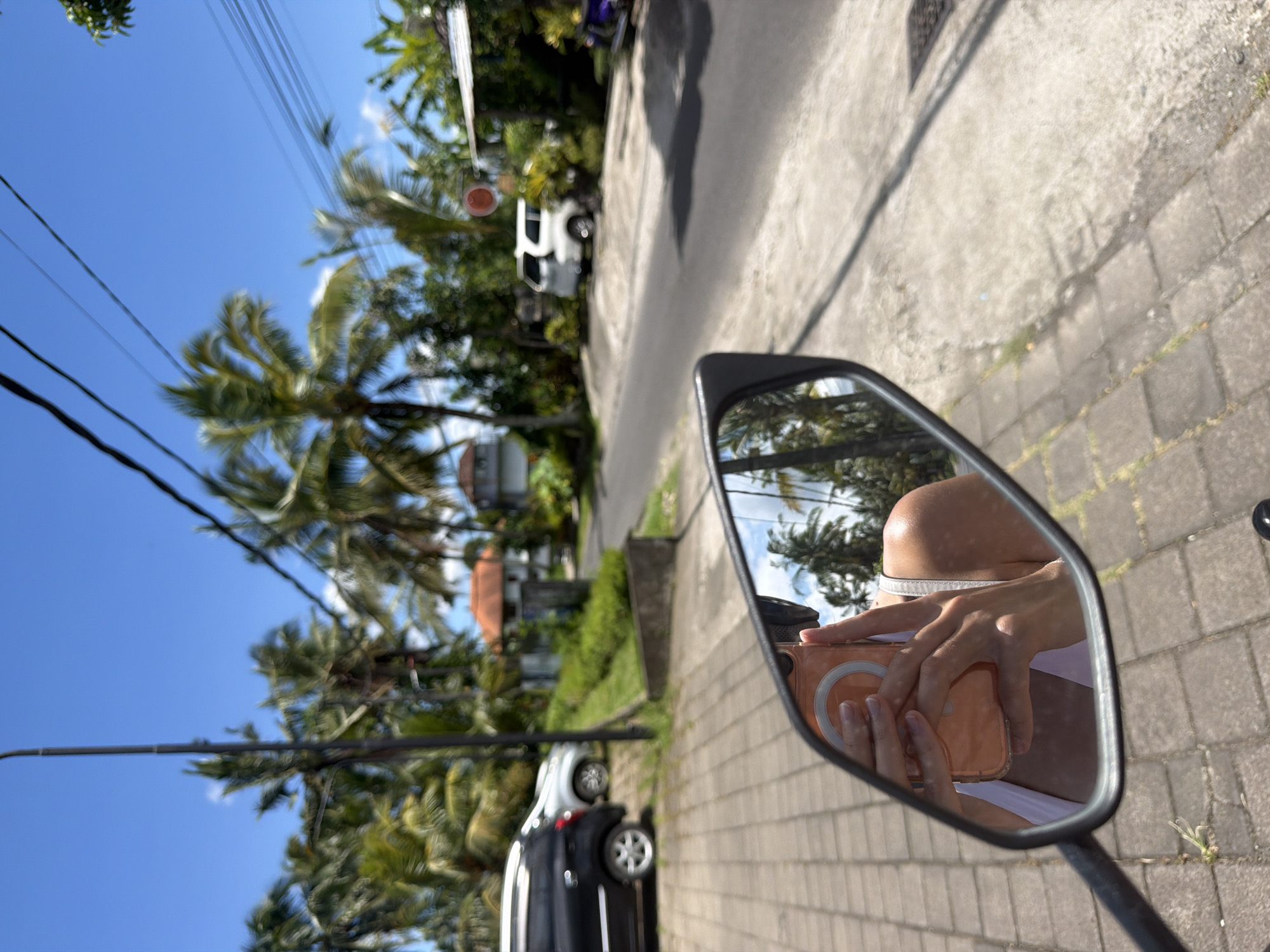 Here is a description of the image: The image shows the side mirror of a motorbike in Ubud, Indonesia, capturing a reflection of a person taking a photo with an orange smartphone. The background shows a street with palm trees, power lines, houses, and parked cars. The sky is visible and is blue. The road is made of interlocking stones.
