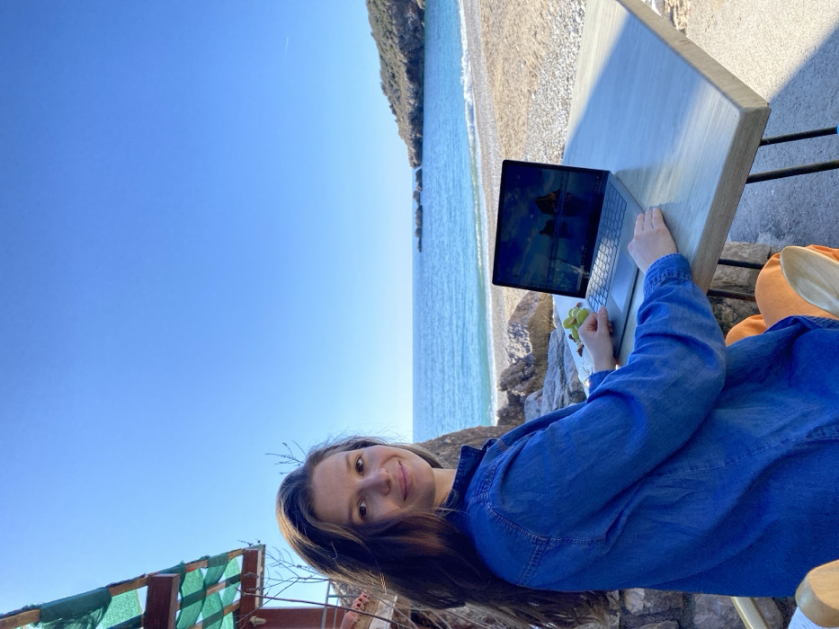 The image displays a single female subject seated at an outdoor table on a pebble beach in Drobnići, Montenegro. The woman, with long dark brown hair, wears a blue denim shirt and orange pants, and looks towards the camera with a subtle smile. Her left hand rests on a silver-colored laptop, which is open on the light-toned wooden table and displays a dark background image with reflected elements. A cluster of green grapes is positioned to the left of the laptop on the table. Behind the subject, a stone wall is visible, and in the upper left, a wooden structure with a green mesh canopy is partially shown. The background features the clear blue Adriatic Sea with gentle waves breaking on the light pebble shore. A rocky, vegetated headland with several small rock formations in the water is visible to the right of the sea. The sky above is uniformly clear and blue, indicating bright daylight.