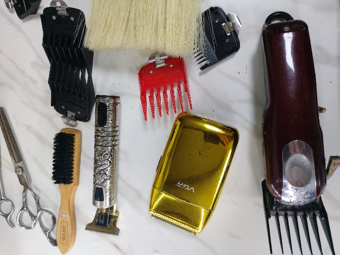 - "The scene displays various barbering and hairstyling tools arranged on a light-colored, possibly marble, surface with subtle gray veining" by FM-xMf1b2, licensed under CC BY 4.0